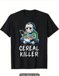 * Made from cotton fabric. The design features a cereal killer theme. It's a fun and unique shirt for any occasion.